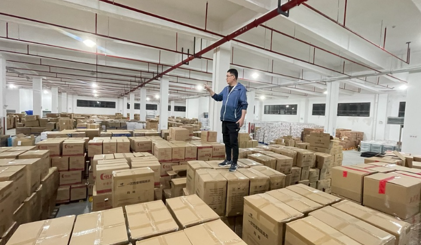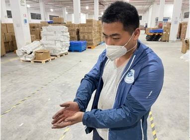 这批物资包装方式比较简单,到货时,多数包装已经破损,只能人工把重新分拣包装,罗文东从此变成了“袋”王,每天解决数以千计的“七天大礼包”,蓝色包装堆叠成了“袋”山。