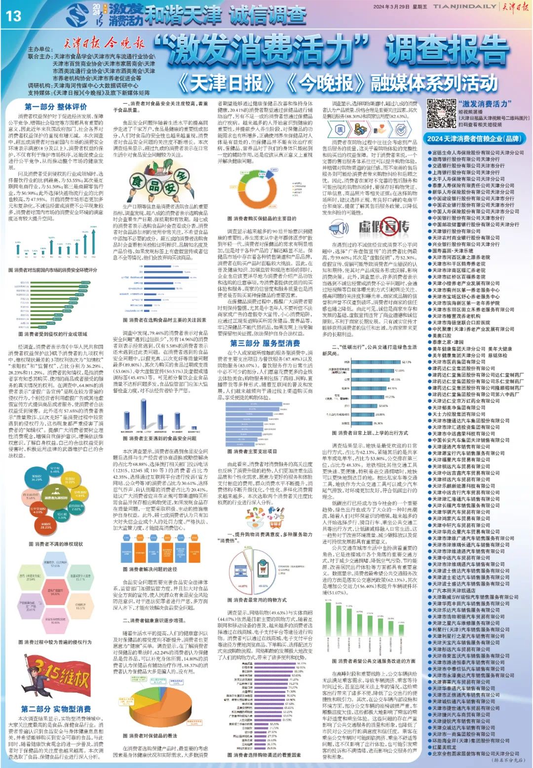 “和谐天津•诚信调查”活动,是《天津日报》联合天津市多家行业协会发起的,旨在践行党报社会责任,走进市民服务群众的一项公益活动,至今已连续举办13届。本届活动围绕“放心消费在天津”主题,由《天津日报》、《今晚报》两大主流媒体,联合海河传媒中心大数据调研中心及天津市多家行业协会,采取机构联合调研、消费者问卷调查等方法,对消费者进行了广泛调查,研究结果以2024年“和谐天津.诚信调查”白皮书《“激发消费活力”调查报告》公开发布,并根据消费者调查结果,同步发布了2024年天津消费者信赖企业(品牌)榜单。
