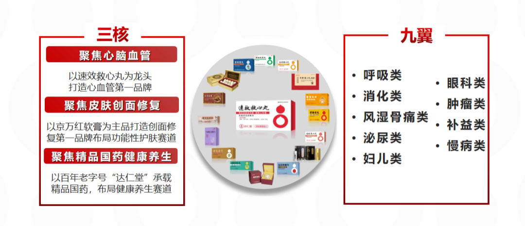 第一核是心脑血管产品线,以速效救心丸为龙头,统筹通脉养心丸、舒脑欣滴丸、参附强心丸等产品矩阵的市场协同,提供心脑血管领域多病种解决方案;第二核是皮肤创面修复,以京万红软膏为主品种,强化创面修复品牌;第三核则是达仁堂精品国药,推动清宫寿桃丸、安宫牛黄丸、牛黄清心丸等产品发展。